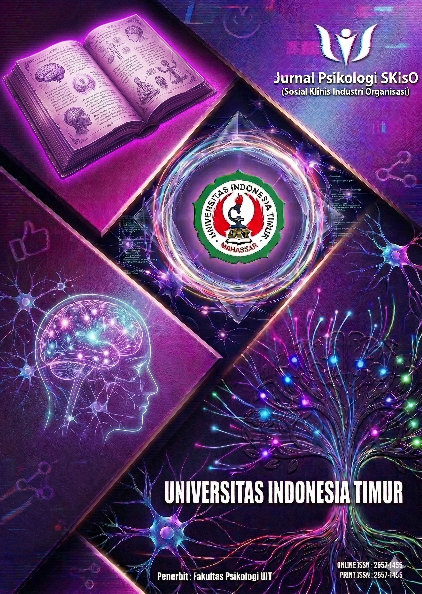 JURNAL PSIKOLOGI SKIsO (Sosial Klinis Industri Organisasi) merupakan jurnal yang memuat karya ilmiah dan artikel-artikel dari berbagai bidang ilmu psikologi seperti psikologi klinis, psikologi Sosial, psikologi pendidikan,psikologi industri, psikologi Organisasi, psikologi gender dan psikologi perkembangan anak maupun prenatal. Jurnal ini diterbitkan oleh Fakultas Psikologi Universitas Indonesia Timur setiap 6 bulan sekali yaitu pada bulan April dan bulan Oktober.